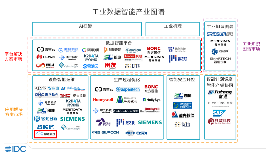 近期,國際權(quán)威研究機(jī)構(gòu)IDC發(fā)布了《工業(yè)數(shù)據(jù)智能市場分析報告,2021》。報告全面分析了中國工業(yè)數(shù)據(jù)智能市場的發(fā)展背景、定義、典型應(yīng)用場景、市場空間、競爭態(tài)勢,并重點(diǎn)介紹了目前中國工業(yè)數(shù)據(jù)智能市場產(chǎn)業(yè)圖譜,其中因聯(lián)科技名列設(shè)備智能運(yùn)維領(lǐng)域代表廠商。